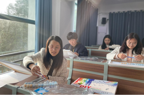 校领导朱雪林、贾娴雅也来到学校活动现场,与女教职工们一并绘制油画,并进行亲切交流,为女职工们送去了节日的美好祝愿。