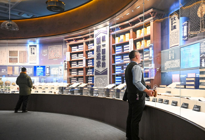 2023年12月23日,参观者在北京民族文化宫参观铸牢中华民族共同体意识文物古籍展。新华社记者 郝建伟 摄
