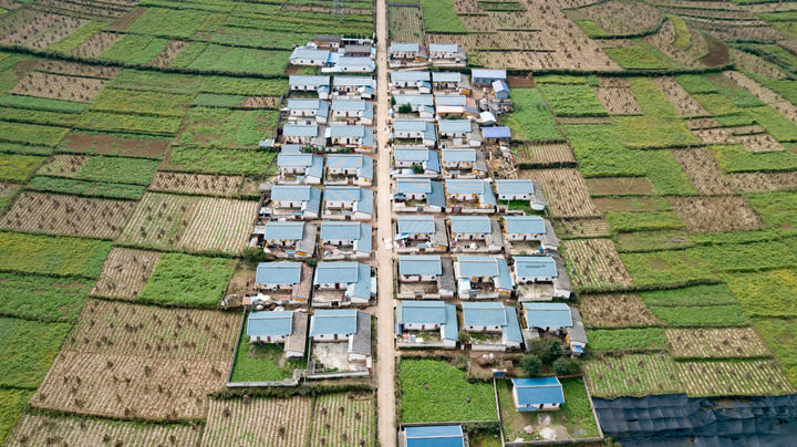 俯瞰四川省昭觉县地莫乡地莫村田园中的新居(2020年10月10日摄,无人机照片)。新华社记者 张笑宇 摄