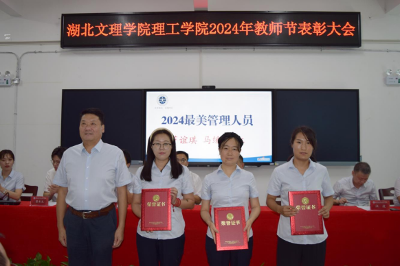 (党群工作部 邓琳子)年年桃李,岁岁芬芳。为扎实推进“教师队伍建设年”活动,广泛宣传新时代人民教师“四有”好老师形象,在第40个教师节到来之际,学校在1教105报告厅召开2024年教师节表彰大会。会议由副校长周伟主持,全体校领导、中层干部、受表彰人员及学校教职工代表参会。
