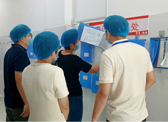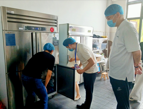 徐敏一行实地排查了建筑设施、绿化区域及易积水处等蚊虫易滋生地,详细了解防蚊灭蚊等措施的落实情况。她强调,防蚊灭蚊是阻断登革热传播途径的关键,务必确保各项防控措施得到严格有效的执行。随后,徐敏一行将视察重点转向食堂区域,根据“登革热”防治工作的要求,对食堂的卫生环境、食品安全、消毒工作、灭蚊消杀工作进行全面细致的检查。