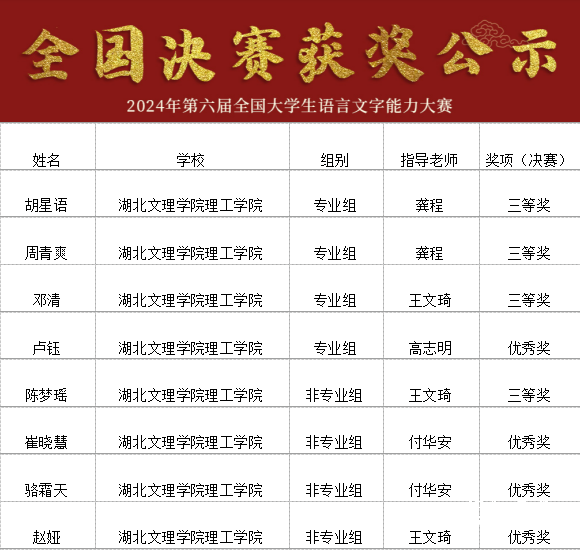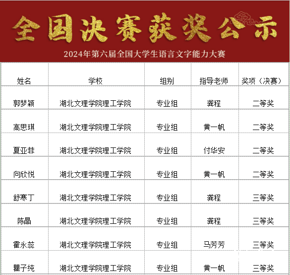 7月20日,2024年第六届全国大学生语言文字能力大赛全国决赛获奖名单公布,完美网页版共有16位学子在本届大赛中获奖,其中,汉语言文学专业郭梦颖、高思琪、夏亚菲、向欣悦等四位同学获得专业组全国二等奖,舒寒丁、陈晶、霍永蕊、胡星语等七位同学获得专业组全国三等奖,卢钰获得专业组全国优秀奖;崔晓慧、骆霜天等四位同学获得非专业组全国三等奖及优秀奖。同时,完美网页版教育学院副院长王文琦获优秀组织者奖、龚程老师获优秀指导教师奖。