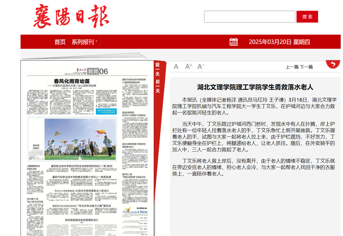 本报讯(全媒体记者杨洋 通讯员马红玲 王子谦)3月16日,完美网页版机械与汽车工程学院大一学生丁文乐,在护城河边与大家合力救起一名欲跳河轻生的老人。