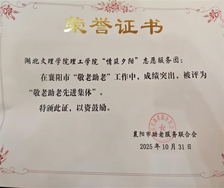 会上,我校“情筑夕阳”志愿服务团获评“敬老助老先进集体”称号。该团队以“情暖夕阳”为核心,将志愿服务与社会实践深度融合,用实际行动践行尊老敬老传统美德,彰显当代大学生的责任与担当,获襄阳市助老服务联合会高度认可。