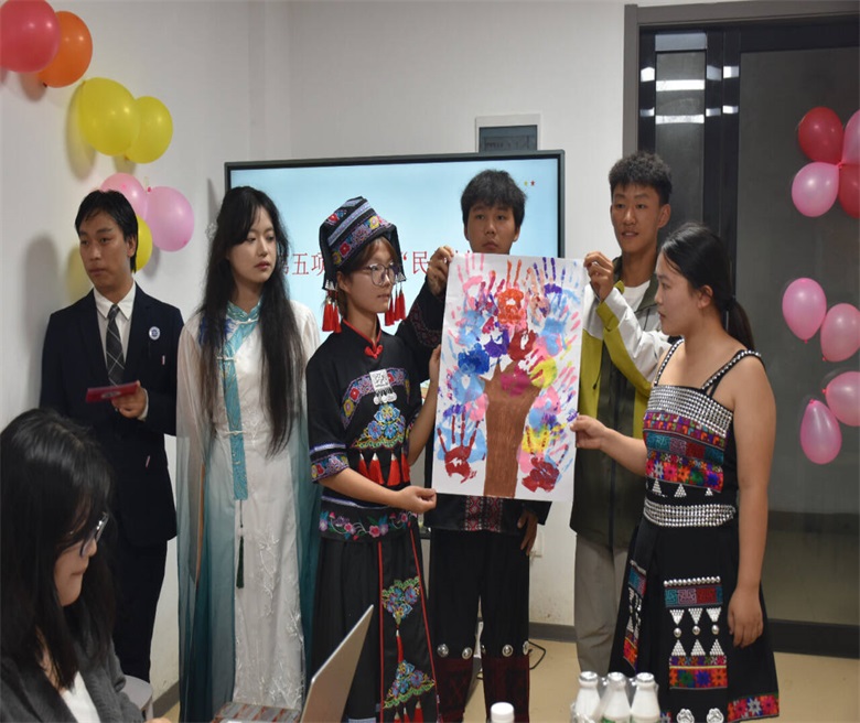 “五十六个星座五十六枝花,五十六族兄弟姐妹是一家……”全体师生齐唱《爱我中华》,激昂的旋律凝聚起民族团结的磅礴力量。歌声中,不同民族师生的手紧紧相握,传递出“中华民族一家亲”的深厚情感,彰显了新时代各族人民像石榴籽一样紧紧抱在一起的精神风貌。随后师生们以七彩手印共同绘制“民族同心树”,斑斓的手印化作枝叶,托举起象征中华民族共同体的树干,寓意“各族师生同心同德、同向同行”。这幅作品将被永久珍藏,成为学院民族团结教育的鲜活教材。