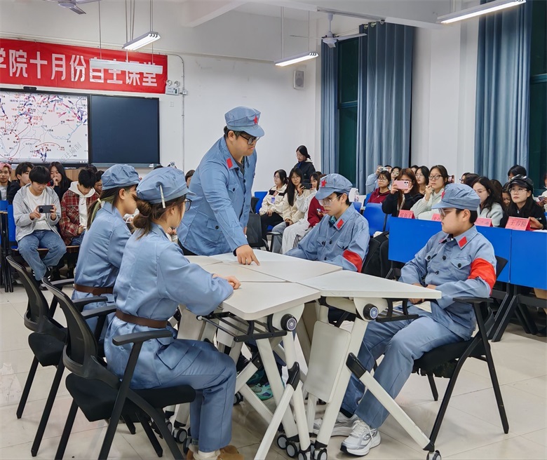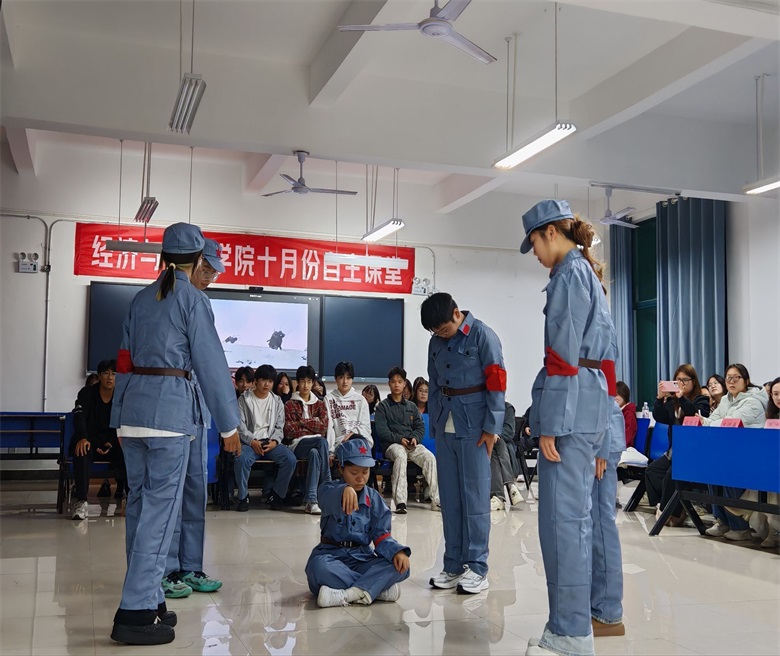 (经管学院 聂雅精)为传承和弘扬伟大长征精神,厚植学生爱国情怀,10月27日晚上,经济与管理学院自主课堂长征情景剧展演在一教307教室成功举行。学院党总支书记王春柳及全体辅导员参加活动,与同学们共同重温长征岁月,感悟红色力量。