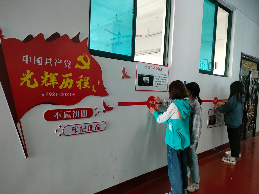 学生党员亲手制作粘贴“经管系党史文化长廊”,并讲解自己所张贴党的光辉历程图的一个完美网页版党的故事,献礼建党百年。
