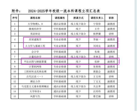 根据学校公示结果,李淑一老师的《房屋建筑学》、刘琦良老师的《土力学与基础工程》以及张婷老师的《平法识图与钢筋算量》这三门课程获评。