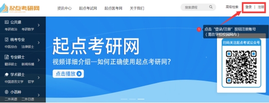 *校园网IP范围内使用电脑登录《起点考研网》即可访问,如需在外网使用该资源,请先在校园网IP范围内登录《起点考研网》并注册账号,注册成功后,该账号可在外网和微信版登录使用。校园网IP范围内登录微信版也可绑定微信或注册账号。