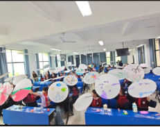 手工制作环节,大学生志愿者们分发了制作香囊的材料和空白油画伞,随后详细示范了绘画技巧和香囊制作步骤。在大学生的耐心指导下,小学生们充分发挥想象力,裁剪布料、填充香料、缝合装饰,围绕清明主题创作出了一个个独一无二的香囊和油纸伞。