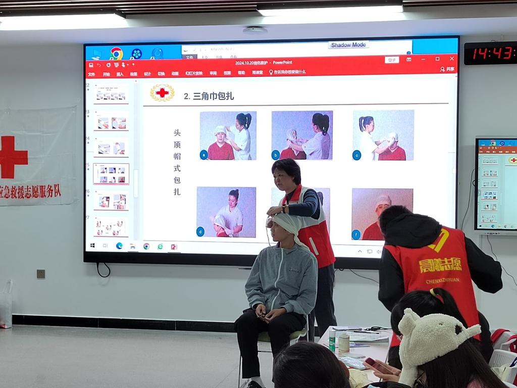 培训现场,老师们用通俗易懂的语言列举案例,通过多媒体展示、现场互动的授课形式,向参加培训的志愿者们讲解了红十字运动基本知识,并且现场演示了危急情况下如何对患者进行紧急救护。培训的尾声,志愿者们以两人为一组的形式进行模拟紧急救护考核,在老师们细致的指导下,参与考核的学子们纷纷顺利完成救护考核项目。
