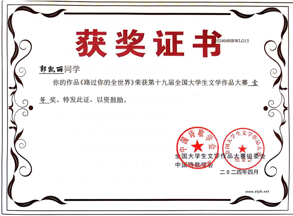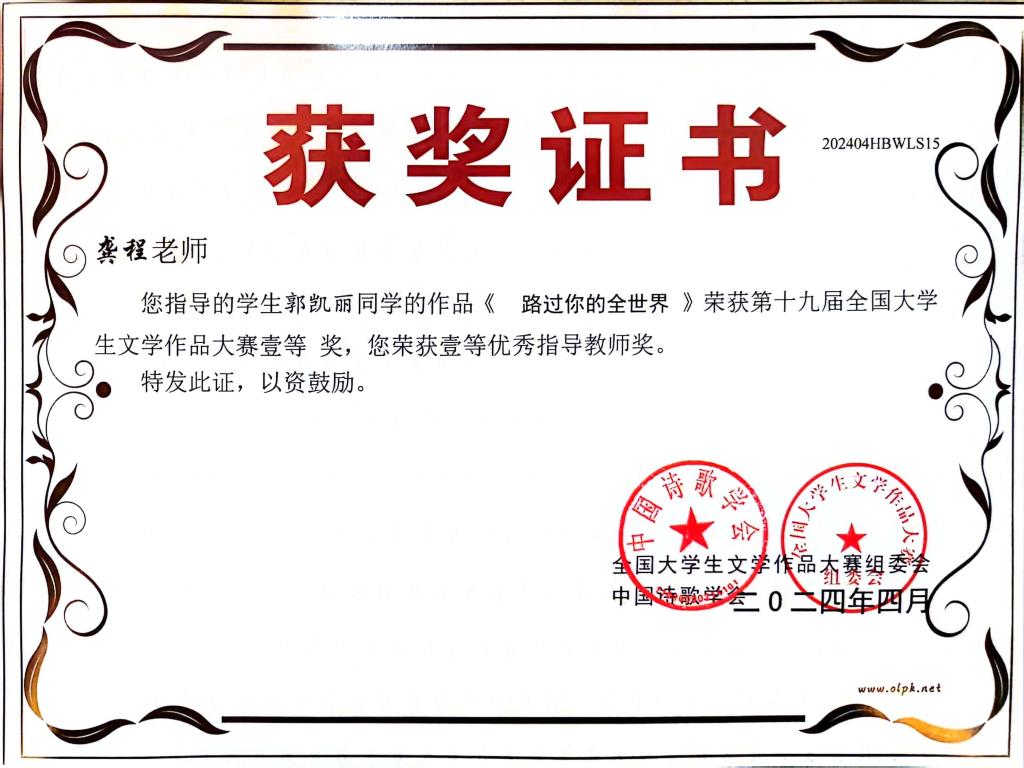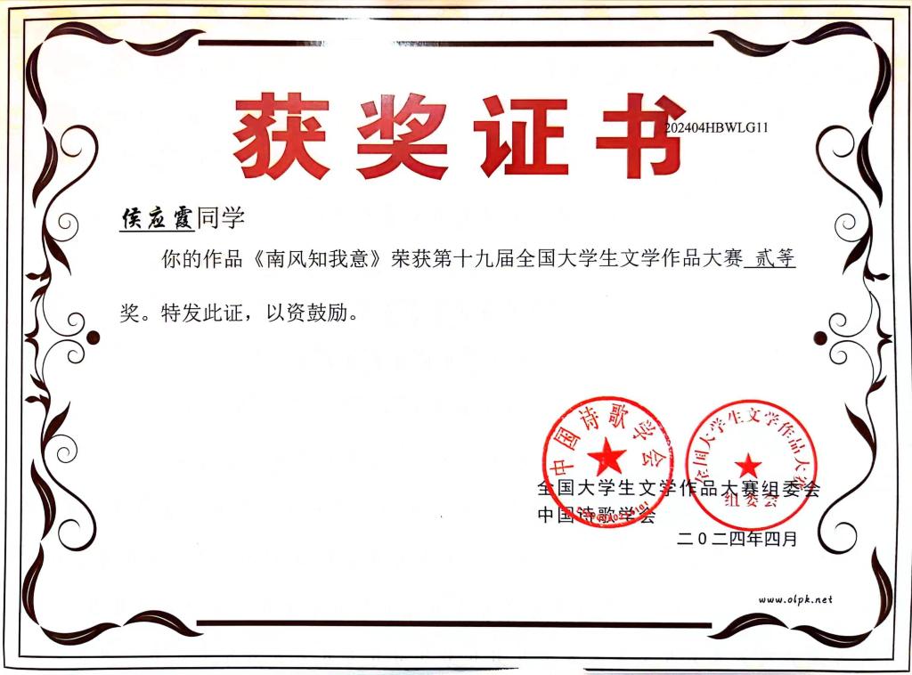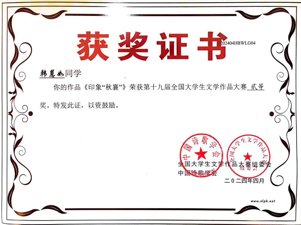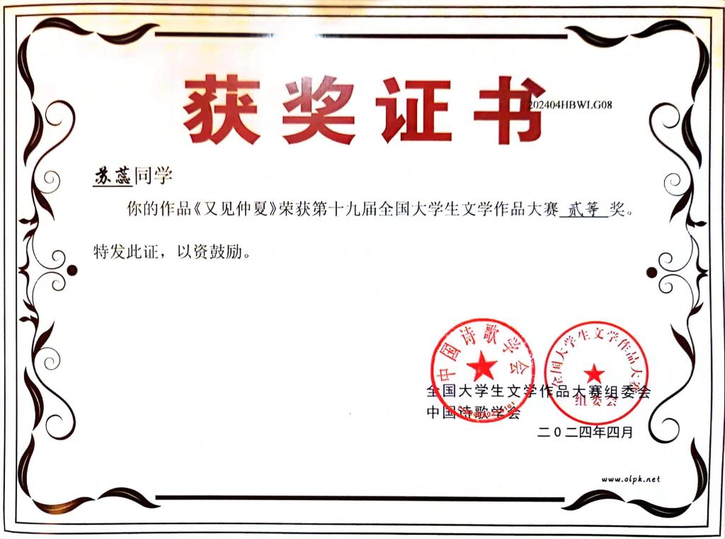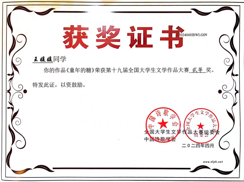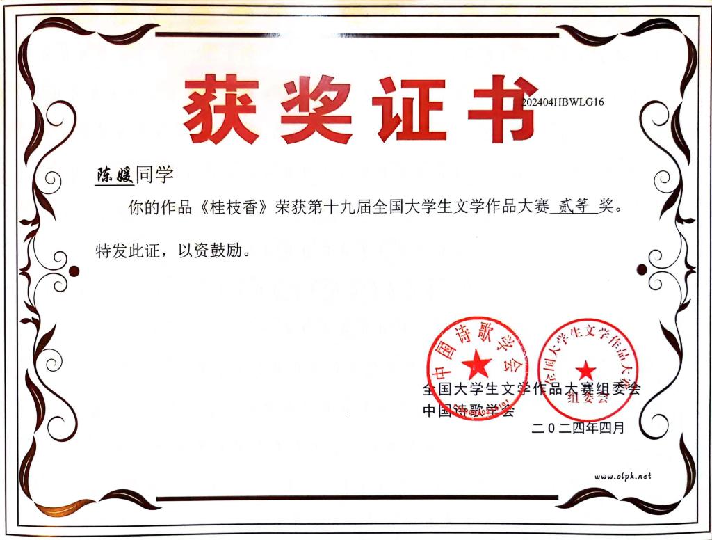据悉,第十九届全国大学生文学作品大赛是中国作协直属的中国诗歌学会指导、湖北省散文学会承办的一项面向全国高校的国家级文学赛事,旨在激发大学生的文学创作热情,发现文学新锐,繁荣校园文化。