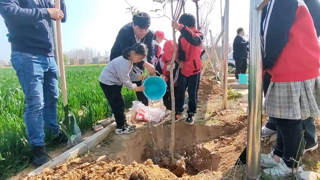 (外语系 王凯)种下一棵树,守护一片土。在第45个植树节到来之际,为倡导绿色生态环境,从小培养小学生爱树护树意识,3月11日,我校二十余名师生前往襄州区朱集镇下湾村文化广场,同当地的小学生大手拉小手,共同开展植树节植树认养活动。朱集镇副镇长胡晋文、校团委副书记桂梦怡、外语系党总支副书记骆小青出席活动。