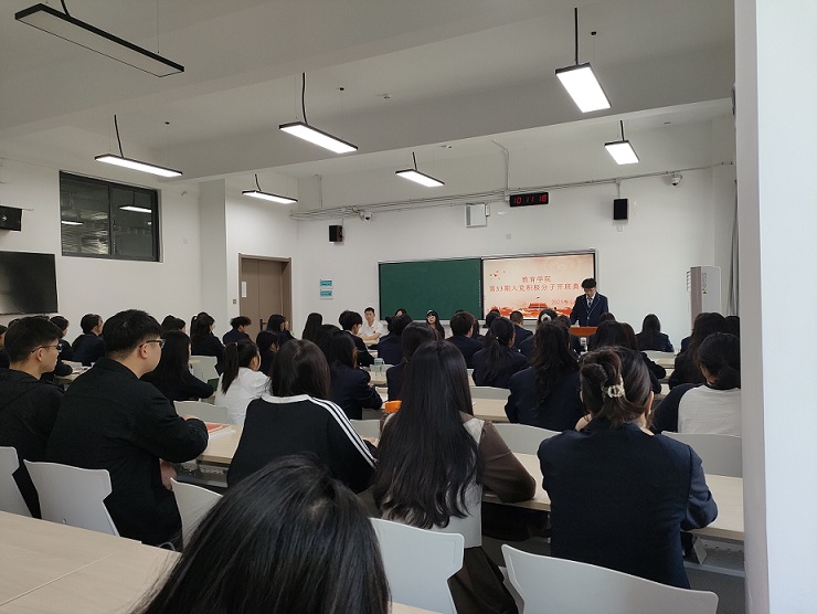 (教育学院 聂汉虹 方浩男)2024年4月15日中午,教育学院第33期积极分子培训班开班仪式在东津校区J12-214举行。教育学院学生党支部书记聂汉虹、22级辅导员陈曦、23级辅导员武晶洁、专升本辅导员郭辉及培训班全体学员参与本次活动。开班仪式由教育学院学生党支部书记聂汉虹同志主持。在庄严的国歌声中,开班仪式正式开始。