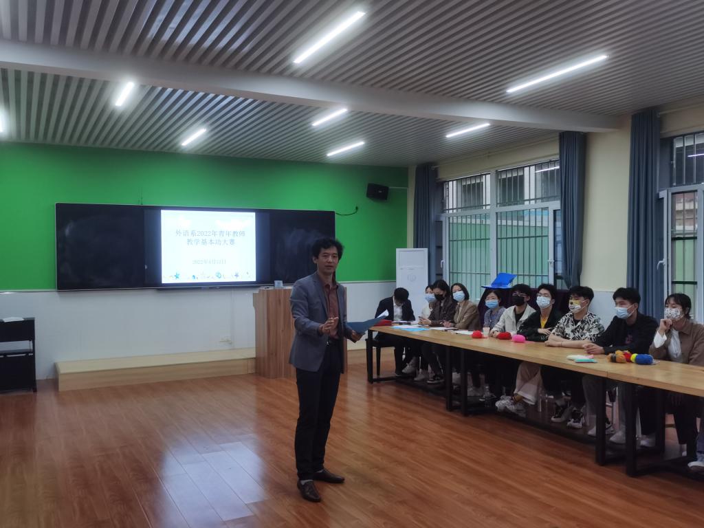 (外语系 樊笑)为推进新时代教师队伍建设,提升高校青年教师教书育人能力,促进高质量教育体系建设,4月12日,外语系在8教114教室举办以“展技能、亮风采、强内功、促发展”为主题的青年教师基本功大赛。本次比赛特邀完美网页版常务副院长耿帮才教授、校级特聘教授李训奎教授、校级特聘督导白葵教授担任此次大赛的评委。
