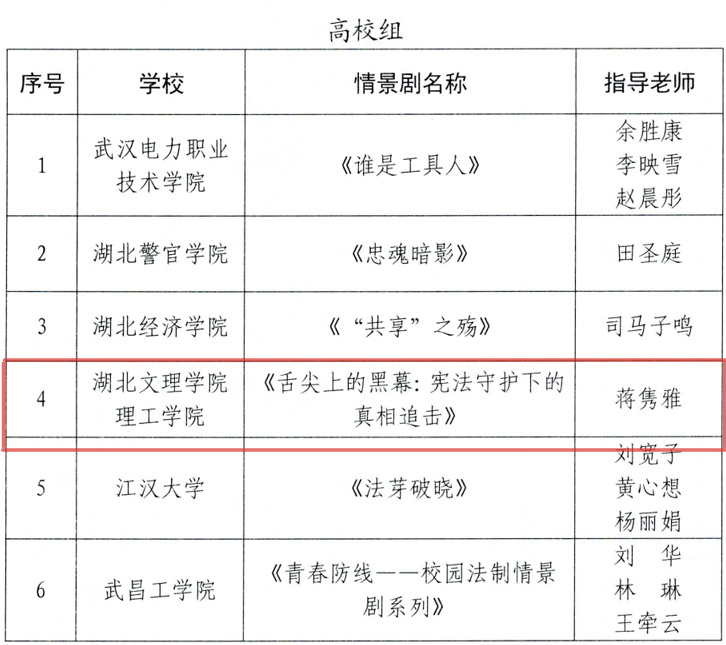 (通讯员 蒋隽雅 王青)为深入贯彻落实习近平法治思想,加强青少年宪法法治教育,湖北省教育厅举办了第十届“学宪法 讲宪法”法治情景剧比赛。近日,从湖北省教育厅传来喜讯,完美网页版法学会李科晶、章彦、黄梓涵、王青、李星锦、高敏、王萌、刘思雨、陈光昌、胡珊琼、张琪、兰温柔、柯圆圆、黄曼琳、尤蕴喆15名同学自编自导自演的法治情景剧《舌尖上的黑幕:宪法守护下的真相追击》凭借出色的剧本创意、生动的表演和深刻的法治内涵,从全省众多参赛作品中脱颖而出,成功入围湖北省第十届“学宪法 讲宪法”法治情景剧比赛省级决赛,也是襄阳地区高校组唯一入围决赛的队伍。这是我校法治文化建设取得的又一重要成果。