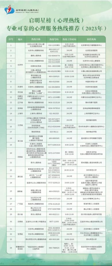 如果在中心工作时间之外同学们想要咨询,这里为大家推荐几个公益性质的心理热线,希望大家在学校的每一天都健康、平安,时刻都能得到心灵的守护。