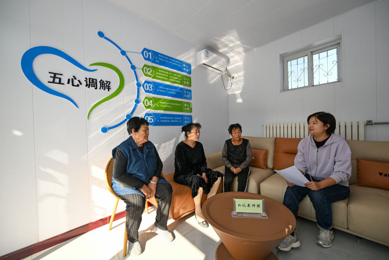 在天津市宁河区芦台街道金华路社区,社区党总支副书记吴蕊(右一)就社区监控设备安装问题为社区居民进行解答(2024年10月11日摄)。金华路社区积极践行新时代“枫桥经验”,将原社区居委会闲置用地提升改造成为联络群众的基层综合治理阵地——“解铃小院”。(新华社记者 孙凡越/摄)